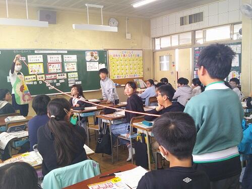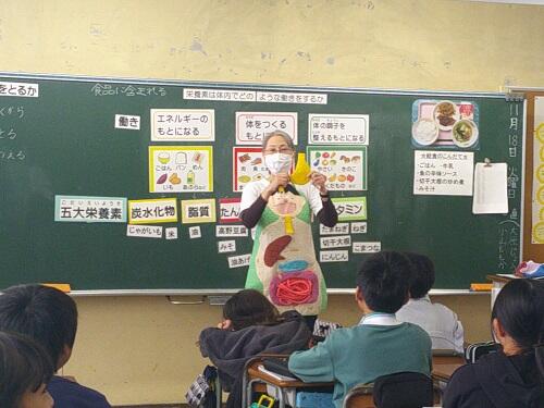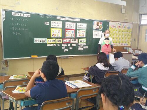 5年生の学級で、栄養士が体の成長と栄養のバランスについて話をしていました。まずは、何のために私たちは食事を取るのかを考えました。それから成長に大切な栄養素を知り、どんな食べ物がその栄養素に当てはまるのか学びました。