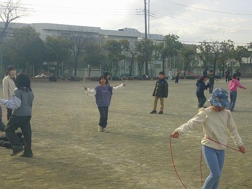 中休みの放送とともに、子ども達は縄跳びを始め校庭が縄跳びのカラフルな色に染まり、とても鮮やかです。一人で黙々練習する子もいれば、教え合い、競い合いながら飛んでいる子もいました。取り組み方は様々ですが、みんな時間いっぱい縄跳びに集中していました。