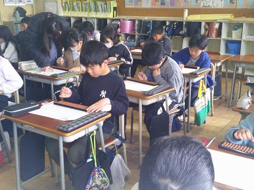 そろばんの先生の教え方が上手なので、子どもたちはすぐにやり方を理解したようです。珠を動かすコツをつかむと簡単なようで、正解を導くことができました。たし算の次はひき算でした。ひき算はもともと苦手意識を持っている子も多く、繰り下がりに苦戦していましたが、こちらもコツをつかんでくると徐々に正確に計算できるようになってきました。できると楽しくなるのが子どもです。楽しくなってそろばんをはじき始めました。こんなに集中している姿を見たことがないというぐらいの集中力でした。中には「そろばん使うと計算が分かりやすい」「楽しい」という子も出てきて、そろばんの楽しさや素晴らしさを感じ取った子がたくさんいました。昔からあるそろばんですが、改めて見るとそろばんのルールは論理的であり、計算の筋道が立てられているなと感心しました。計算力、集中力、記憶力が身につくそろばんの奥深さを感じました。ずっと継承していきたいものです。