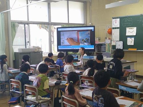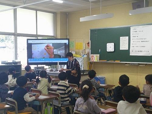 書画カメラを使いながら、鉛筆の持ち方や書き出しの位置の確認をしていました。しっかり画面を見て、確認できています。