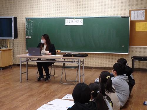 次に、児童指導担当から冬休みの過ごし方について、「ふゆやすみ」の文字に合わせて話がありました。例:「ふ」不審者に気をつけよう