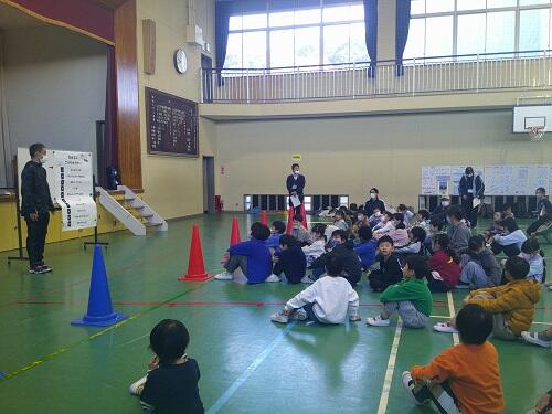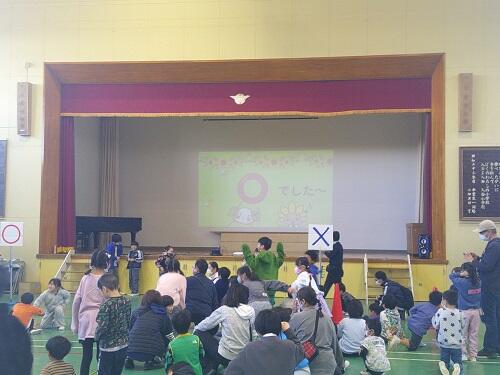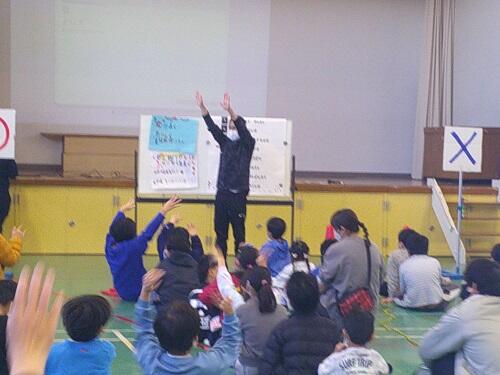 〇✖クイズでは、お互いの小学校のクイズを出し合いました。正解すると歓声があがり、嬉しそうに跳びはねる姿も見られました。クイズは工夫が凝らされ、互いの学校のことを知ることができ盛り上がりました。