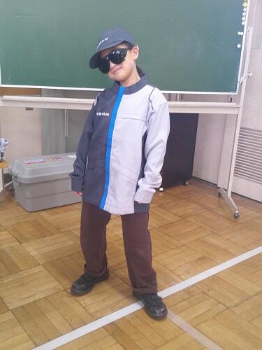 後半は、工場現場で使われている工具や保護具を実際に触ったり、使用したりしながらモノづくりを五感で楽しめる体験をしました。電動工具のボルトの締め付けでは、あっという間にボルトが閉まる工具に驚いたり、ピンボードにピンをいかに速く差し込めるか挑戦したりして、とても楽しそうでした。作業服を着用して、ファスナーが車を傷つけないように布でかぶせてあったり、作業靴のつま先は重たい物が落ちてきても痛くないように硬くしてあったりと様々な工夫を実感していました。