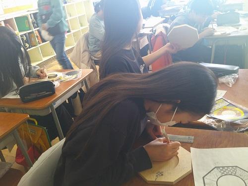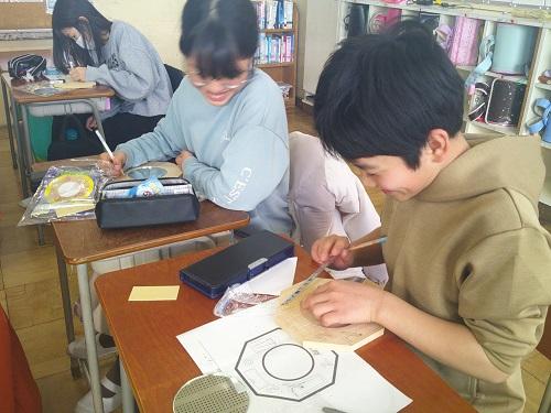 6年生が学校へ来る日は今日を含め、46日となりました。6年生は、卒業に向けて着々と準備を始めています。今日は卒業制作で鏡の周りに図柄を描いていました。図柄は、一人ひとりの思いがこもったものとなっていて、見ていると楽しくなりました。友達とも図柄について話しながら、黙々と作業を続けていました。出来上がりはどのようになるのか今からとても楽しみです。