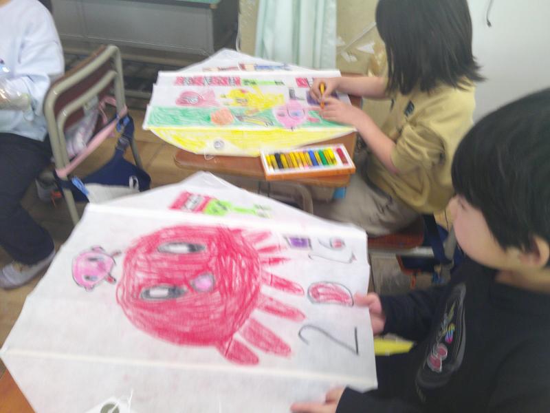 1年生が凧作りをしていました。今日は、凧に絵を描く学習です。思い思いに凧に好きな絵を描き、しっかりと塗ることができていました。大きく描けていて、色塗りもばっちりなので空に凧が揚がったらきっときれいだと思います。まだ、この後に凧に足を付けたり、糸を付けたりする作業が残っているので、凧揚げまで少し時間がかかりそうです。