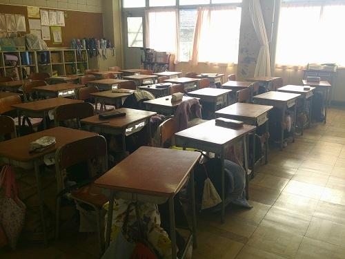 まずは、児童は放送をよく聞き、安全に身を守るシェイクアウトの体勢を取りました。次に、先生の避難指示のもと、ヘルメットを被り、廊下に置かれている窓ガラスの破片の紙を踏まないようにしながら、いつもとは違う避難経路を通って避難しました。静かに速やかに避難をし、全員10分以内に校舎の外に避難することができました。