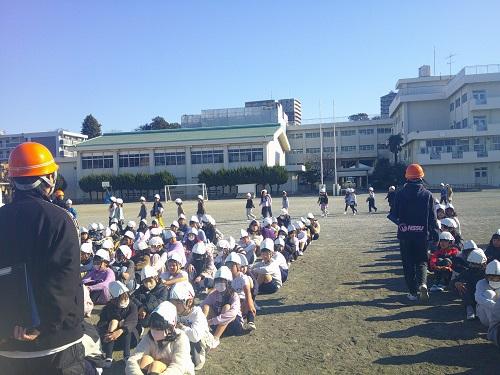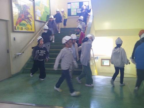 先生の話をしっかりに聞いています。真剣に避難訓練に取り組んでいるのが分かります