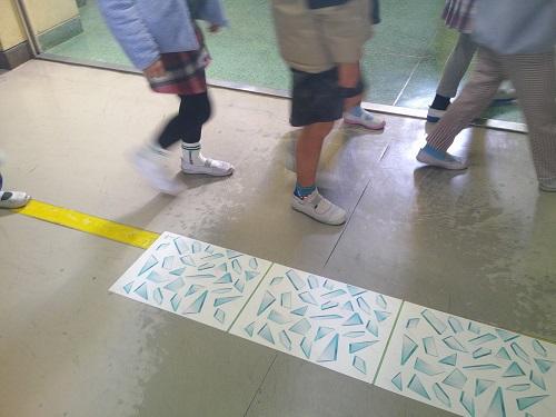 今日の2校時は、地震時の避難訓練でした。今回は、窓ガラスが割れ、2階児童用昇降口の階段が崩れ落ちたという設定での避難です。廊下には、割れた窓ガラスの破片と模したものを置き、2階昇降口は行き止まりにしました。