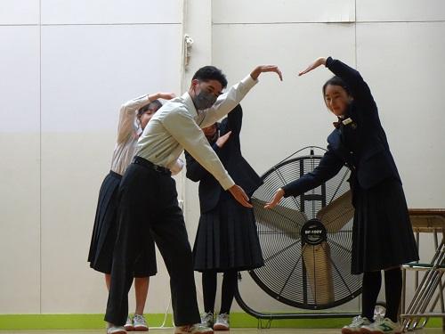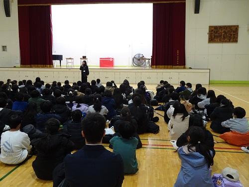 見学した後は、体育館で生徒会による行事の話を聞いたり、部活動の紹介動画を見たりしました。また、生徒会による寸劇やクイズもあって楽しみながら中学校のことを知ることができました。