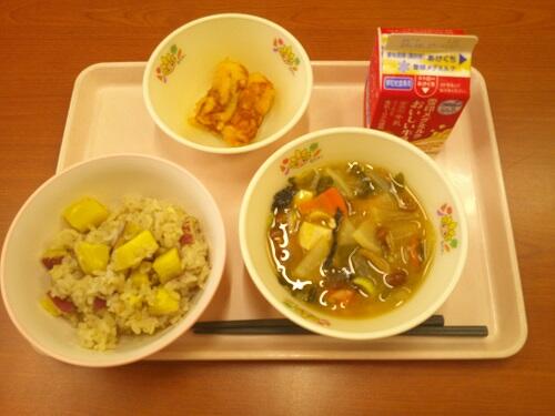 2学期から、米飯給食が新方式に変わりました。今まで一人一缶だった米飯が、自分たちでしゃもじでご飯をよそう方式に変わりました。茶わんと食器かごが新しく導入されました。茶わんは、ピンク・緑・黄色の3色です。どのクラスも上手によそっていました。子ども達は、「食べやすい。」「とてもいい。」と言っていました。おいしくいただきました。