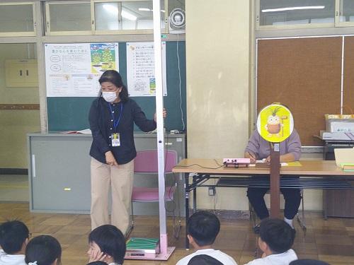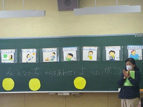 今日は、支援学級の発育測定を行いました。始めに毎日健康に過ごすために大切な事を養護教諭に指導してもらいました。黒板に掲示してある言葉を読みながら、みんなで確認していきました。次に、測定の仕方を学びました。