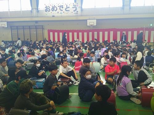 新しいクラスごとに並び、着任式が始まるのをわくわくしながら待っています。