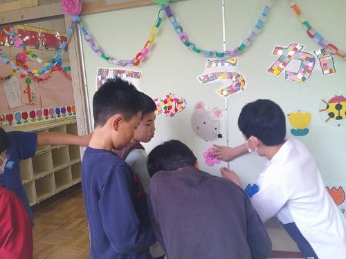 廊下の壁面飾りをみんなで考えながら、飾り付けています。