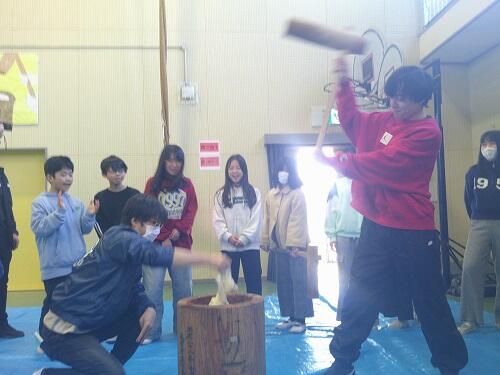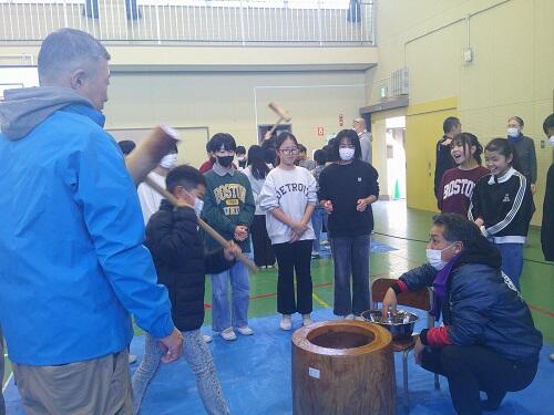 もち米が蒸されると、いよいよ餅つきの始まりです。入谷親藁会の方から説明を受け、各学級に分かれて一人ずつ杵でついていきます。杵が重く、思うように餅をつくのは難しいですが、友達の「よいしょ」や「はいはいはい」という合いの手の声援を受け、皆おいしい餅になるよう頑張りました。杵と臼でお餅をつくのは初めてという子ばかりでしたが、とても上手にお餅をつくことができました。しばらくすると粒々していたもち米が餅へ変化していき、子ども達からは「おいしそう」「早く食べたい」という声が聞かれました。最後は大人の仕上げ、担任の先生の出番です。力のこもった良い音が鳴り響き、子ども達も思わず「おー」と驚きの声をあげていました。