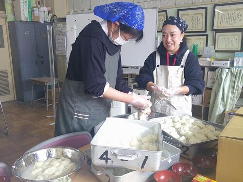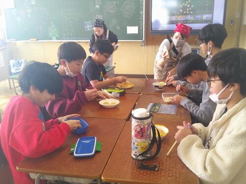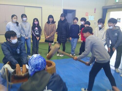 つきたての餅はPTAのお手伝いの方に細かくちぎって、教室に運ばれきなこ餅や醤油餅にして食べました。つきたてのお餅は柔らかく、そしてなめらかでとても美味しかったようです。おかわりも大人気であっという間に完食した6年生でした。